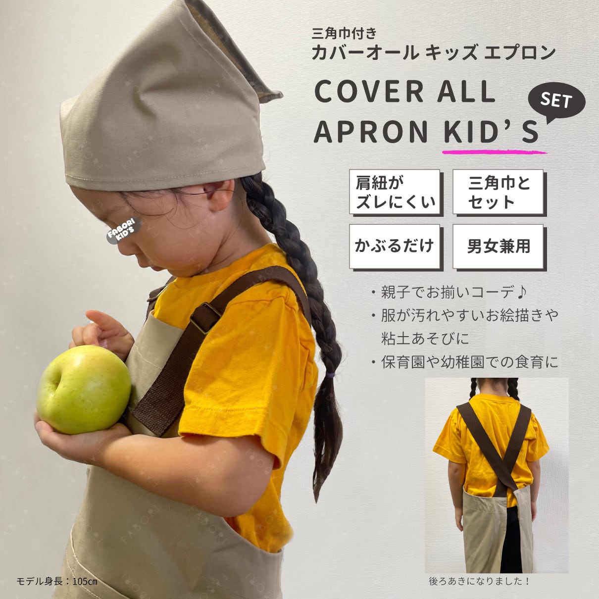 新登場のFABORI cover-all KIDS apron Setは、元気なキッズにぴったりなデザインと機能性を兼ね備えています!お子様の遊びや料理、お絵かきなどの活動をサポートしながら、ファッションとしても楽しんでいただけます。