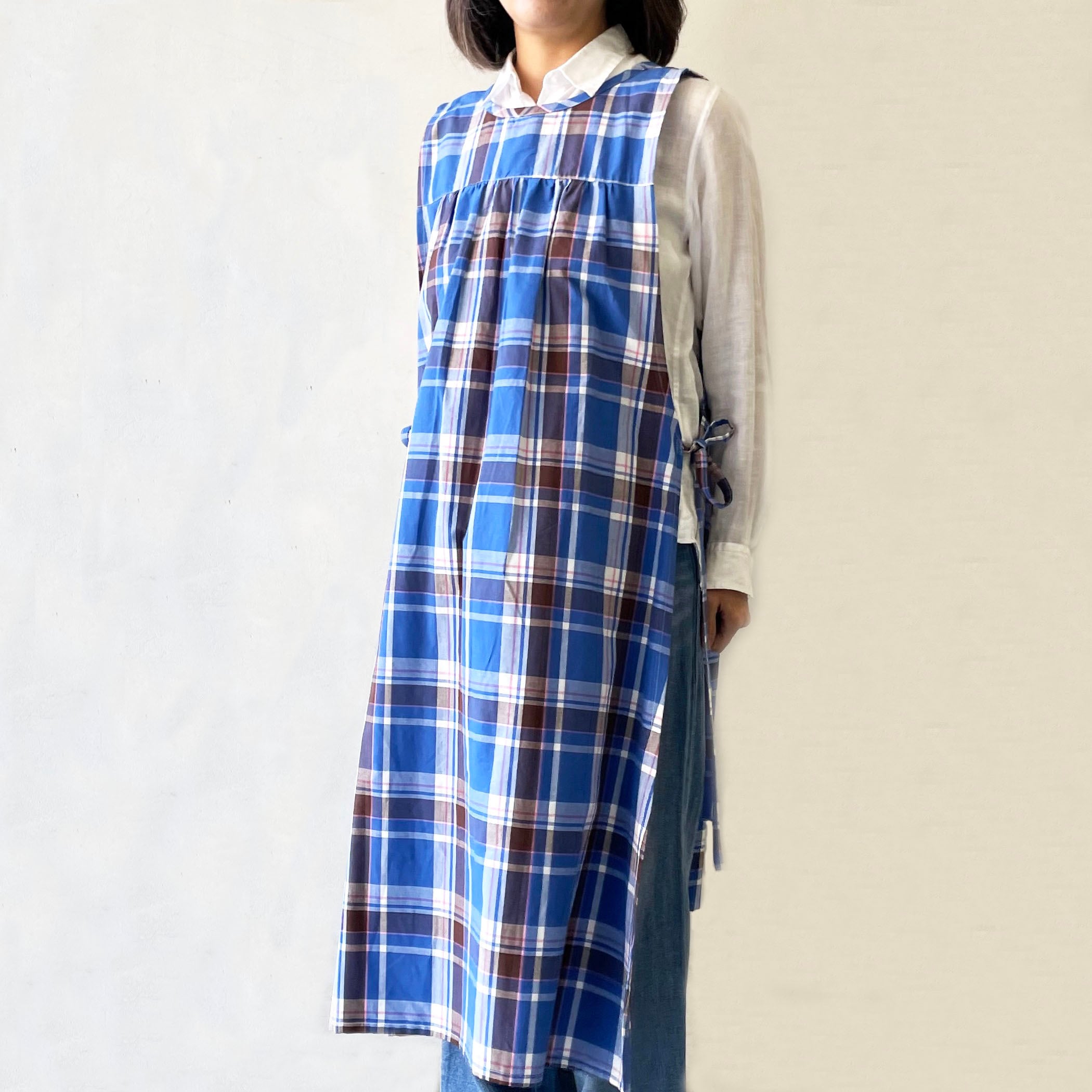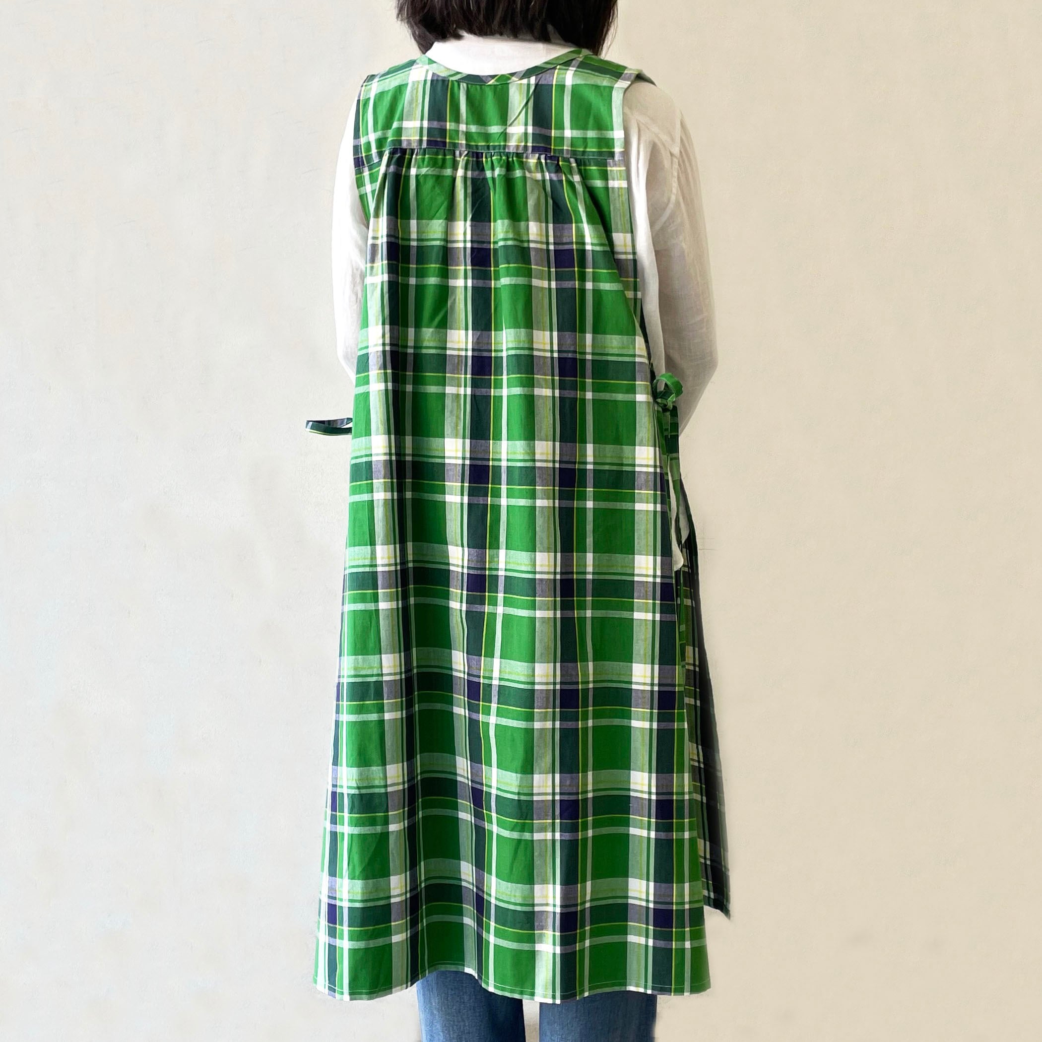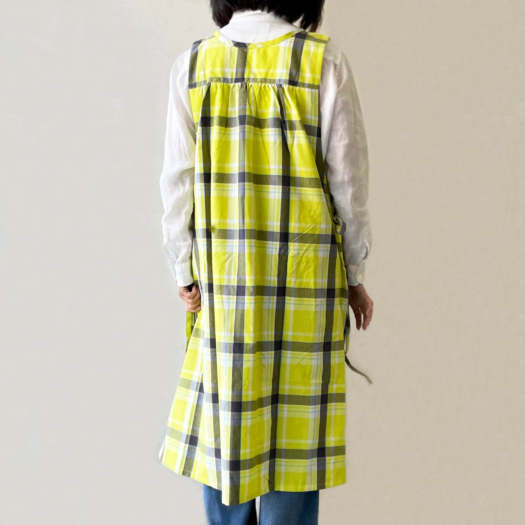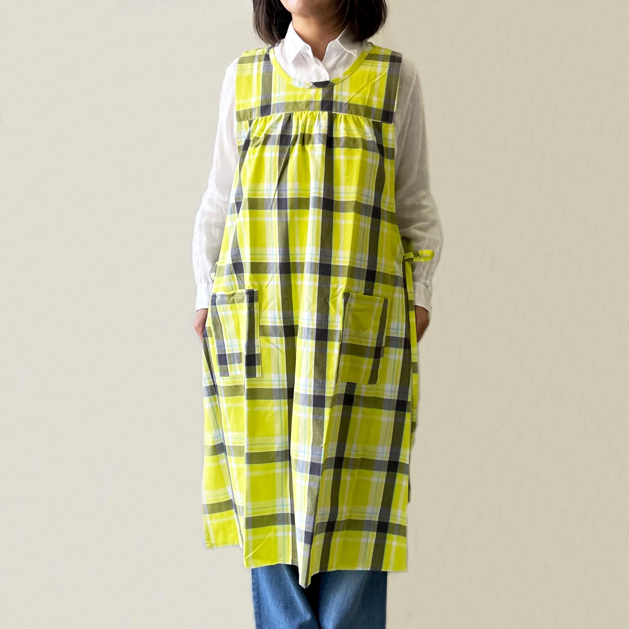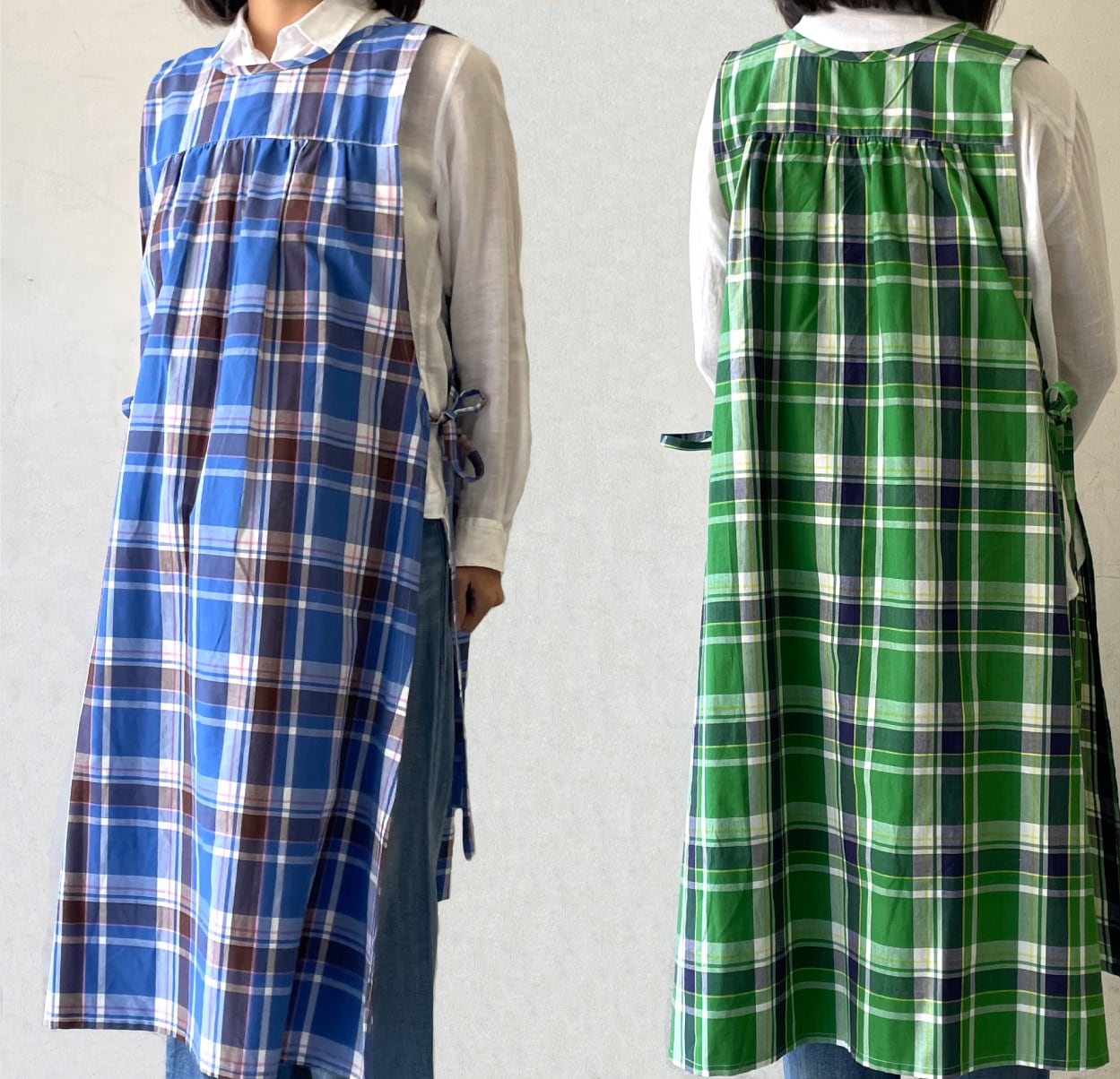 カラフルなチェック柄で元気な気持ちになれるワンピースのような見た目のエプロン。